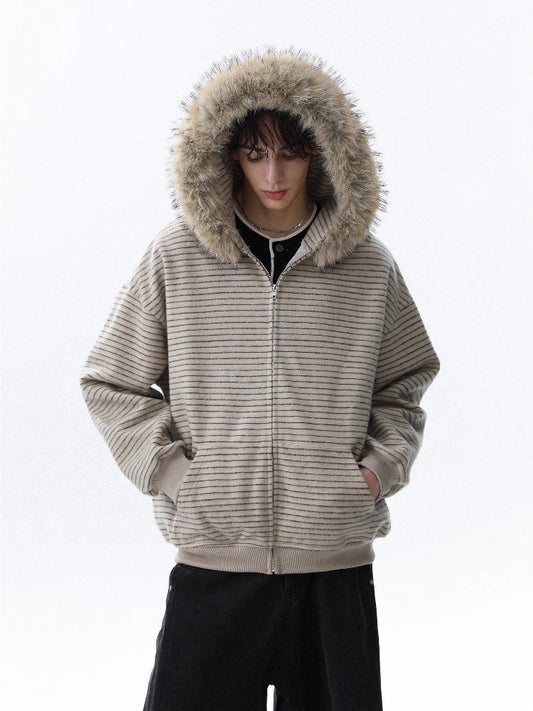 Striped Faux Fur Collar Zip Up Hoodie